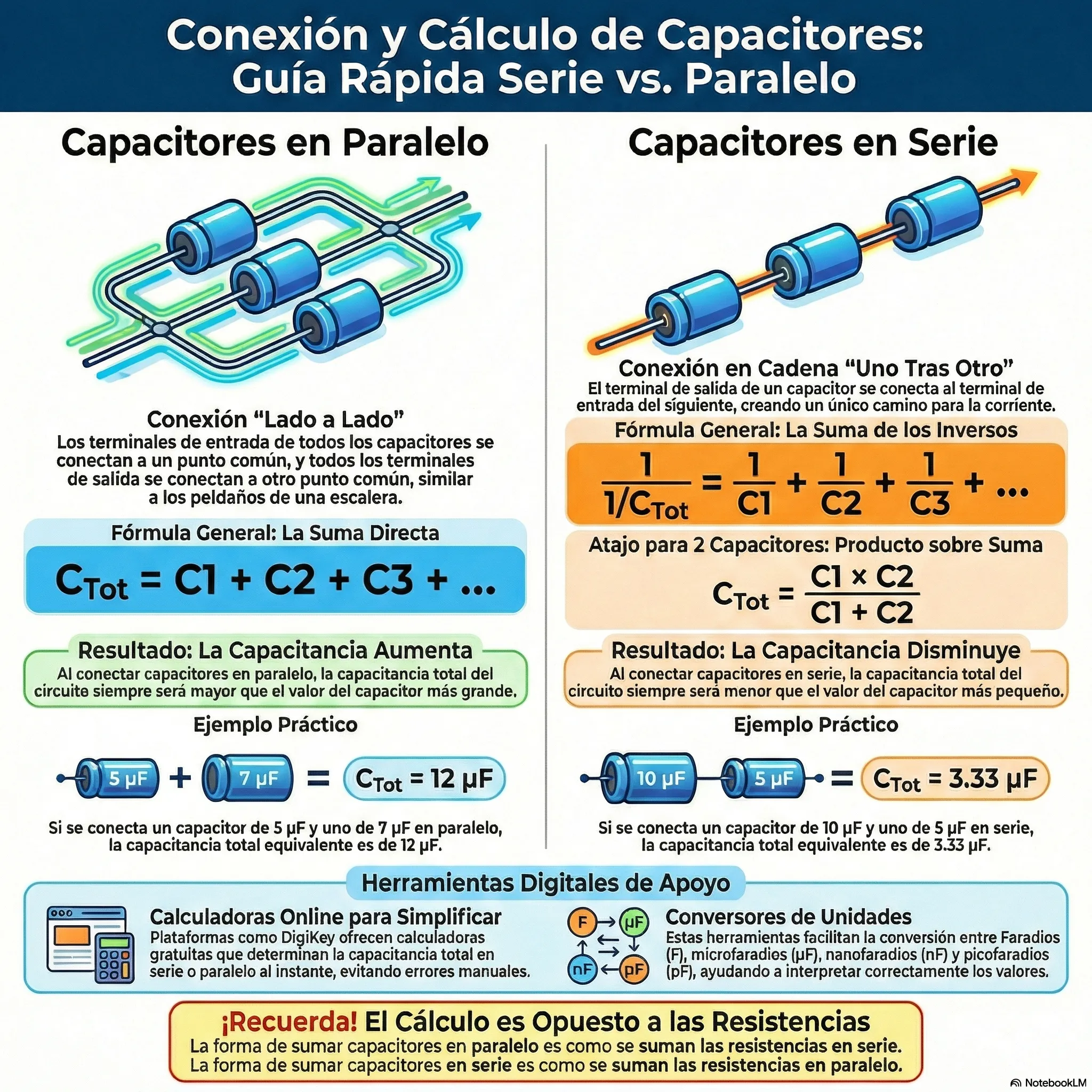 Objetivo de la lección: Comprender las dos formas fundamentales de conectar capacitores en un circuito (serie y paralelo), aprender las fórmulas matemáticas para calcular la capacitancia total equivalente y conocer herramientas digitales para facilitar estos cálculos.