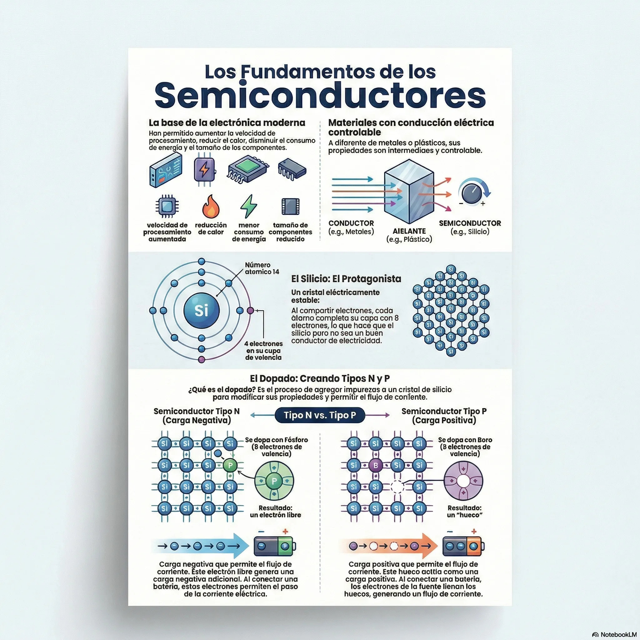 A los semiconductores se les pueden agregar ciertas impurezas con el fin de modificar sus propiedades eléctricas y permitir el flujo de corriente. Este proceso es conocido como dopado y se logra al intercambiar algunos átomos de Silicio por átomos de otros elementos.