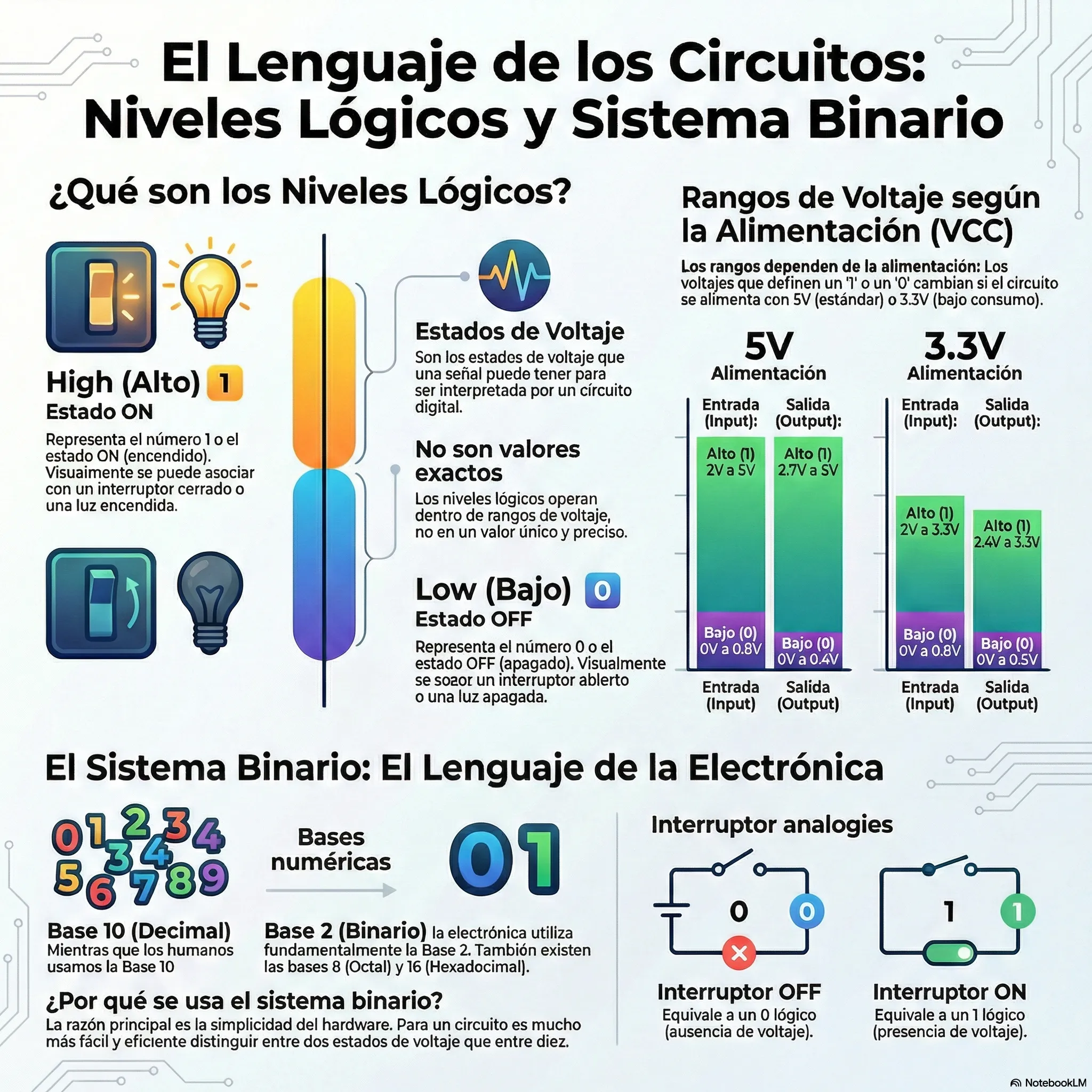 Los niveles lógicos son los estados de voltaje que una señal puede tener para ser interpretada por un circuito digital. En electrónica digital, solo manejamos dos estados: