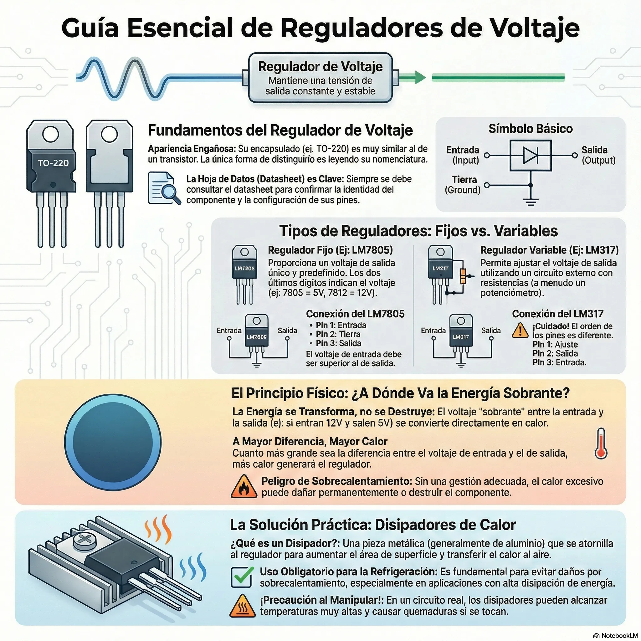 ¿Qué pasa con el voltaje «sobrante»? Si entran 10V y salen 5V, esa diferencia de energía no desaparece; se transforma en Calor.